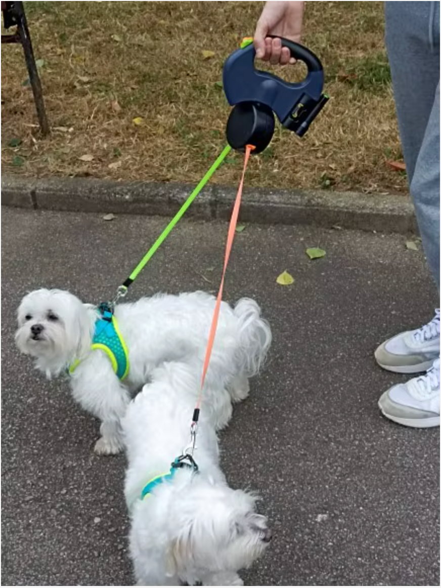 Walk two dogs from one handle: two independent brake/lock buttons and a 360° rotating hub prevent tangles when they cross.